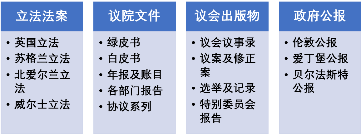 英国政府出版物在线数据库是英国立法、议会、上下议院、英国公报等机构的政府出版物集成库,包括四大模块: