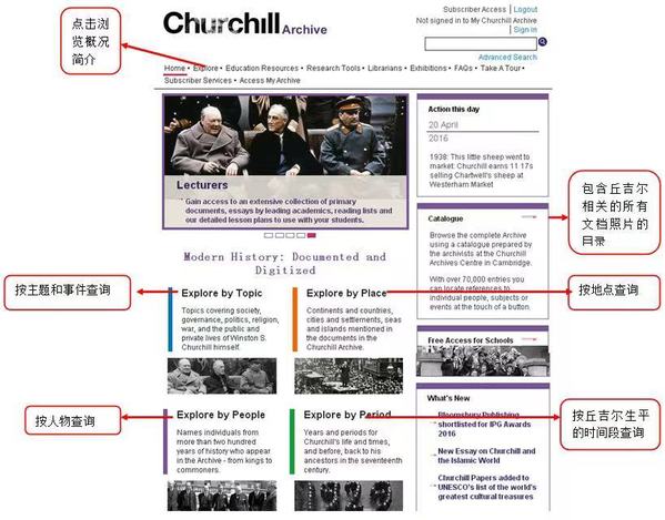 丘吉尔档案馆是一座现代国际历史的数字图书馆,它包括超过八十万页1874年和1965年之间的原始文档。文档记录了跨越布尔战争到冷战之间的丘吉尔与十九世纪和二十世纪的领袖之间的书信交流。