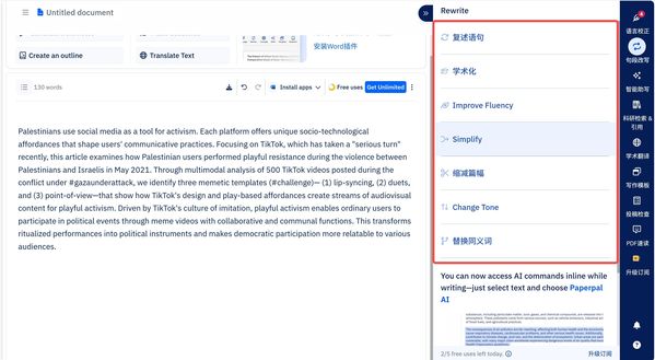 若需优化特定句子或段落,可使用 Paperpal 的句段改写功能。操作简单,选中文本,选择所需改写类型(如“学术化”或“简化”),结果即时呈现。选中即改的模式无缝融入写作流程,便于快速尝试不同优化方向。