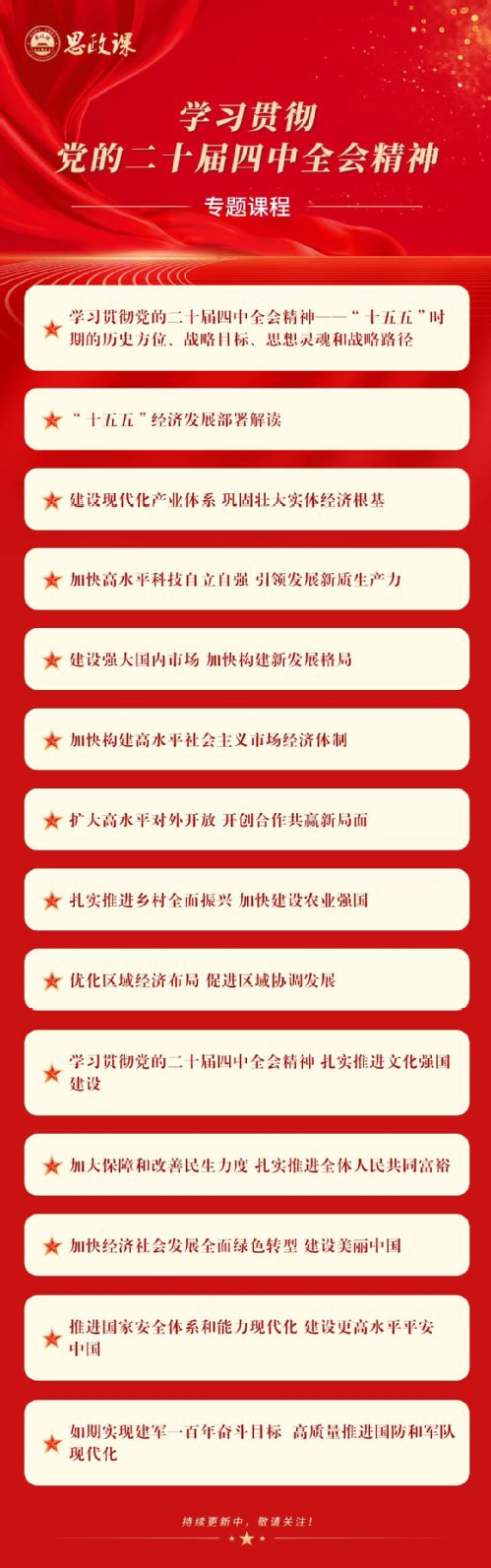 为帮助广大师生深入学习宣传贯彻党的二十届四中全会精神,引导广大师生深入学习领会“十五五”规划建议的指导方针和主要目标,把思想和行动统一到全会精神上来,图书馆特开通“思政课数据库”试用,为师生提供《学习贯彻党的二十届四中全会精神》专题课程,由各领域权威专家学者围绕全会精神及“十五五”规划建议进行详细解读。