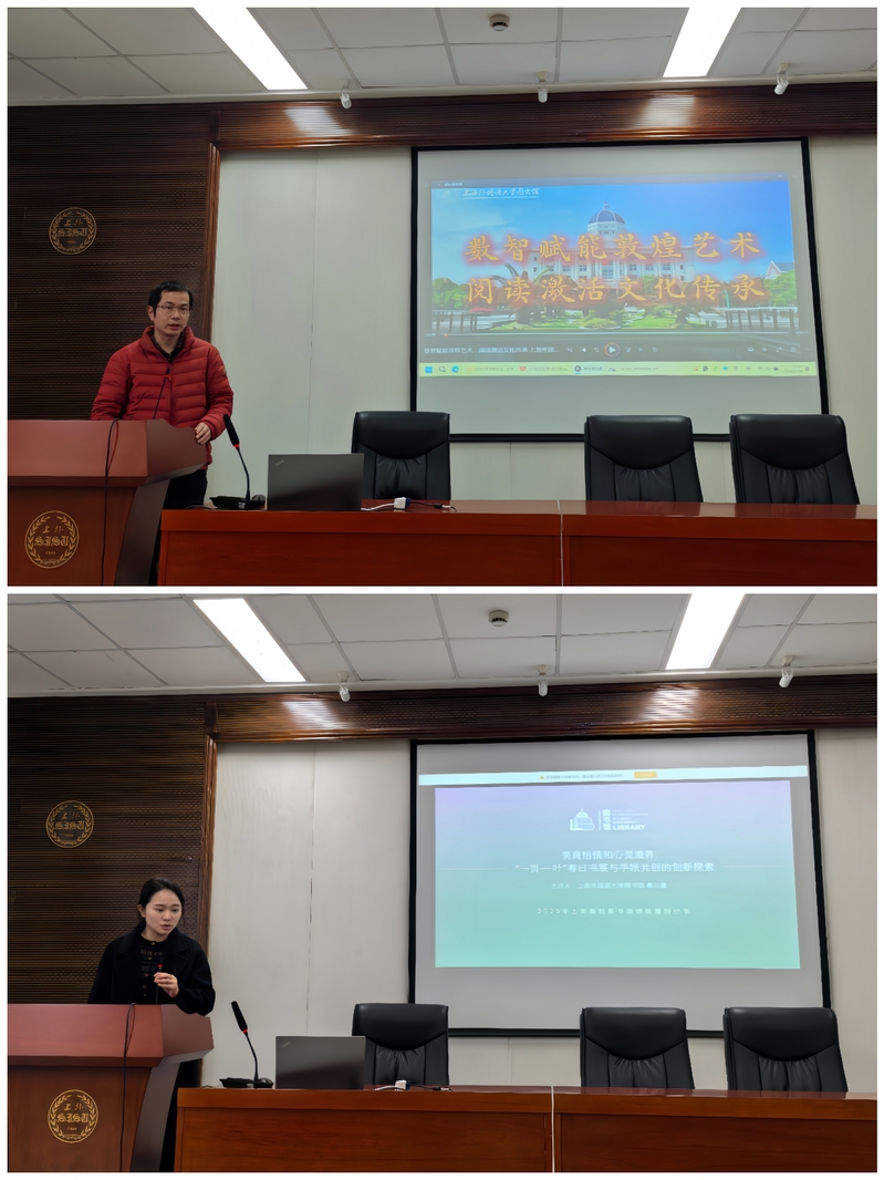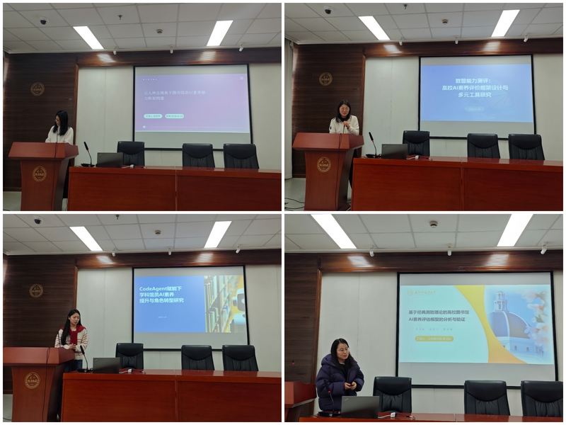 本次报告会集中展示了图书馆2025年度的科研攻坚与实践创新成果。会上,六篇荣获各级奖项的优秀论文与业务案例作者代表依次登台分享,内容涵盖 AI 素养教育、数智化文化传播、创新服务实践等多个前沿领域,充分展现了馆员们扎实的学术功底与开拓进取的专业精神。在 AI 素养教育研究板块,荣获2025年上海市图书馆学会年会一等奖的《元人种志视角下图书馆员 AI 素养能力框架构建》,从独特的研究视角出发,为图书馆员 AI 素养培育提供了系统性解决方案;第十一届全国外语院校图书馆联盟年会一等奖的《数智能力测评:高校图书馆 AI 素养教育多维评价体系的创新构建》,深耕 AI 素养教育评价领域,为高校开展相关教育提供了科学依据;上海市图书馆学会 “AI 素养教育” 征文一等奖的《基于经典测验理论的高校图书馆 AI 素养评估模型的分析与验证》,通过实证研究完善了 AI 素养评估方法,兼具理论深度与实践价值;2025年上海市图书馆学会年会二等奖的《CodeAgent 赋能学科馆员 AI 素养提升与角色转型研究》,探索了技术赋能下馆员职业发展的新路径,为图书馆人才队伍数字化转型提供了有益借鉴。这些研究成果紧扣教育数字化战略行动要求,彰显了图书馆在 AI 素养教育领域的前瞻性思考。