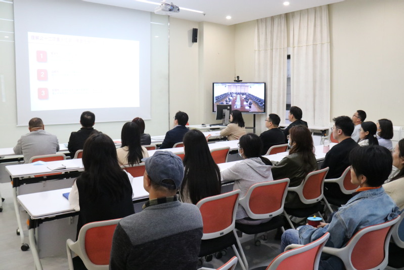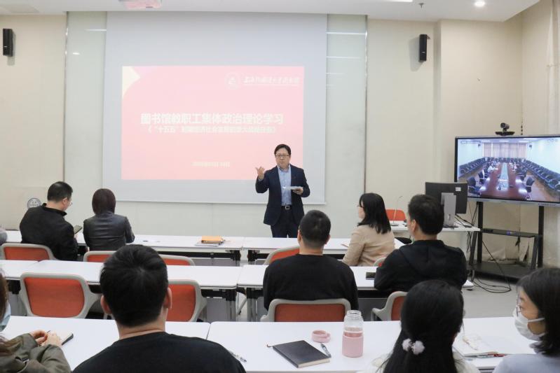 为深入学习宣传贯彻党的二十届四中全会精神,精准把握“十五五”时期经济社会发展战略任务,2026年4月16日,图书馆组织全体教职工开展政治理论集中学习,听取中央党校(国家行政学院)经济学教研部曹立教授在线专题讲座。学习在两校区图书馆会议室同步进行,由图书馆党总支书记赵衍主持。