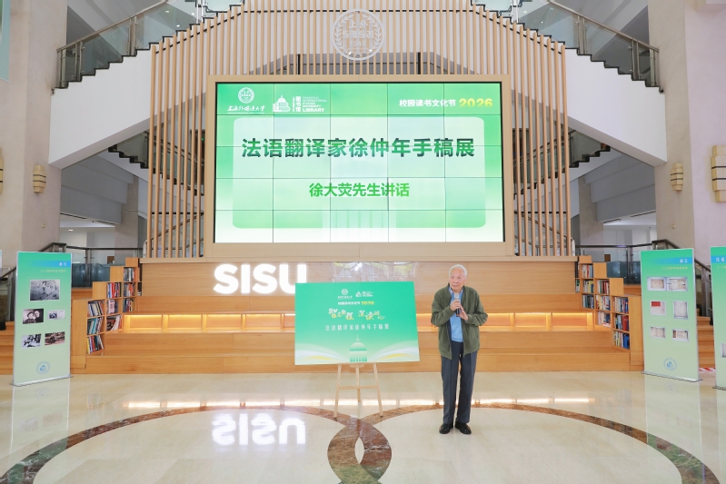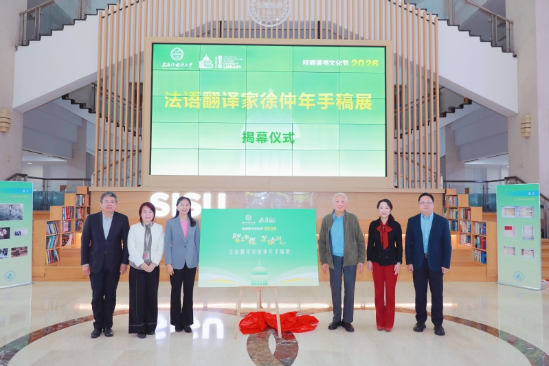 随后举行了“译苑传薪——法语翻译家徐仲年手稿展”揭幕仪式。此次展览依托上海图书馆徐仲年手稿展材料,展出手稿、书信、著作初版等珍贵文献。校党委书记尹冬梅、徐仲年教授之子徐大荧、党委办公室校长办公室主任蒋昕宇、欧洲学院党委书记施海倩、图书馆党总支书记赵衍、图书馆馆长蔡迎春共同为展览揭幕。